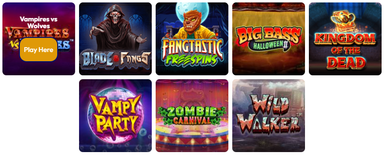 - The qualifying slot games include Vampire vs Wolves, Blade & Fangs, Fangtastic Free Spins, Big Bass Halloween 2, Kingdom of the Dead, Vampy Party, Zombie Carnival, and Wild Walker.
